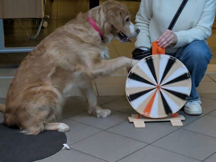 Nachdem uns in der Weihnachtszeit zwei Pferde besuchten, war es nun ein Therapiehund, der Streicheleinheiten einforderte und am Glücksrad begeisterte.